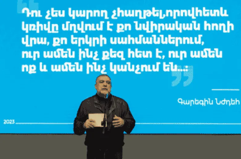 «Սեպտեմբերի 2-ին ես եկել եմ այստեղ որպես զինվոր, որովհետև համարում եմ, որ այստեղ մենք ունենք նույնպիսի իրավիճակ, ինչպիսին ունեինք մոտ 100 տարի առաջ՝ Սարդարապատում: Բոլորս պետք է պատրաստ լինենք պայքարի և թույլ չտալու Արցախի կորուստը: Եվ ինձ համար արդեն կարևոր չէ՝ կունենամ ես պաշտոն, թե՝ ոչ, անգամ եթե միայնակ մնամ, միայնակ եմ պայքարելու այդ նպատակի համար: Բայց ես վստահ եմ, որ միայնակ չեմ, որ շատ են այն մարդիկ, որոնք ինձ նման են մտածում: Երբ այդ որոշումը կայացնում ես, այն մեծ ուժ է տալիս: Մեզնից յուրաքանչյուրն իր ներսում պետք է առերեսվի այդ որոշմանը: Դա դժվար որոշում է, հետդարձի հնարավորություն չի թողնում, և այդ որոշումից հետո միակ ճանապարհն առաջ գնալն է: Այդ ճանապարհին կարող են զոհողություններ լինել, բայց դա ավելի լավ է, քան կորցնել արժանապատվությունդ կամ հայրենիքդ»,- ընդգծել է նա: