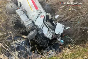 Լոռու մարզում 20 տոննա հեղուկ գազ տեղափոխող բեռնատարը բшխվել է երկաթե արգելապատնեշներին և կողաշրջված...