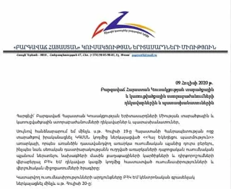 <<Բարգավաճ Հայաստան>> Կուսակցության նախագահ Գագիկ Ծառուկյանի հանձնարարականով <<Բարգավաճ Հայաստան>> կուսակցության Երիտասարդների Միությունը առաջիկա 10 օրերի ընթացքում Հայաստանի Հանրապետության ողջ տարածքով կիրականացնի ԿԳՄՍՆ կողմից ներկայացված <<Հայ Եկեղեցու պատմություն>> առարկայի, որպես առանձին դասավանդվող առարկա ուսումնական պլանից դուրս բերելու, ինչպես նաև սեռական դաստիարակությանն ուղղված առարկաների դպրոցական ուսումնական պլանում ներառելու նախագծերի մասին քաղաքացիների կարծիքների և դիրքորոշումների վերաբերյալ լայնամասշտաբ ուսումնասիրությունների և վերլուծական միջոցառումների շարք։