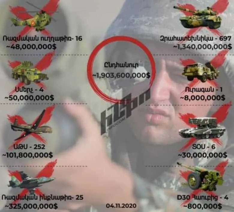 Նոյեմբերի 4-ի դրությամբ՝ Ադրբեջանն արդեն կրել է 1,903,600,000,դոլարի կորուստ: Infocom-ը ներկայացնում է Ադրբեջանի կորուստները՝ դրամական արտահայտությամբ։