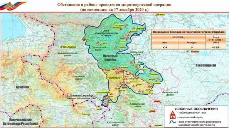 Ռուսաստանի Դաշնության պաշտպանության նախարարությունը հրապարակել է Արցախում խաղաղապահ առաքելության տարածքում տիրող իրավիճակի նորացված քարտեզը: