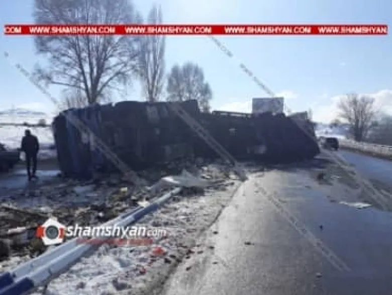 Խոշոր ավտովթար Սևանի գաղութի մոտ. 20 տոննա «Ռոշեն» կոնֆետով բարձված բեռնատարը կողաշրջվել է