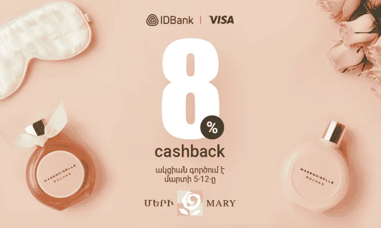 Կանանց տոների առթիվ մարտի 5-ից 12-ը ներառյալ «Մերի» օծանելիքի խանութ-սրահների ցանցից գնումներ կատարելիս վճարե՛ք IDBank-ի Visa քարտերովև ստացե՛ք 8% քեշբեք` գումարի վերադարձ։