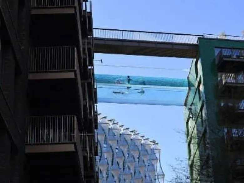 Sky Pool, который прошел «обширные испытания на прочность», чтобы убедиться, что он не упадет на улицу, откроется 19 мая в роскошном жилом комплексе Embassy Gardens на юго-западе Лондона.