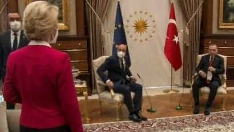 Встреча Эрдогана с фон дер Ляйен и председателем Европейского совета Шарлем Мишелем состоялась в Анкаре 6 апреля. На опубликованных в сети кадрах этой встречи можно было заметить, что организаторы предусмотрели только два стула для участников переговоров на фоне флагов Евросоюза и Турции. Один из них занял Мишель, а второй - Эрдоган.