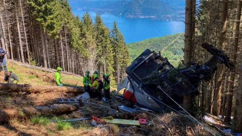 Инцидент произошел на канатной дороге, соединяющей населенный пункт Стреза на берегу озера Лаго Маджоре и гору Монтероне высотой почти полторы тысячи метров. Обрушение линии фуникулера произошло за 300 метров до вершины горы, в районе последнего пилона, на максимальной высоте. На фото с места видно, что серьезно поврежденный вагон лежит на просеке в лесном массиве.