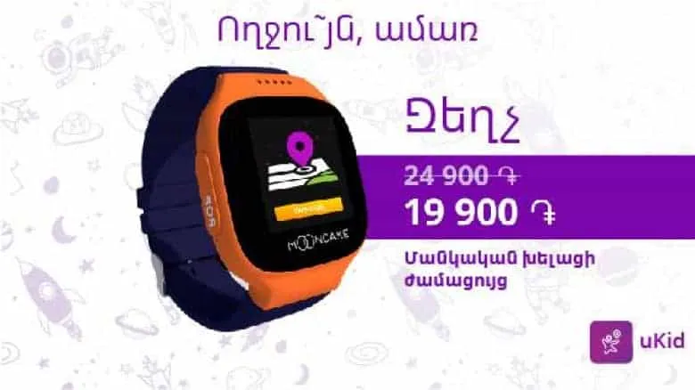 «Ողջու՜յն, ամառ»-ի շրջանակում մինչև հունիսի 30-ը ներառյալ, uKid մանկական հեռախոս-ժամացույցը հնարավոր է ձեռք բերել ընդամենը 19900 դրամով նախկին 24900 դրամի փոխարեն: Այս հատուկ առաջարկից օգտվելու դեպքում մանկական հեռախոս-ժամացույցը կարելի է գնել՝ վճարելով 4900 կանխավճար նախկին 6900 դրամի փոխարեն, և 12 ամիս շարունակ յուրաքանչյուր ամիս uKid խելացի ժամացույցի համար վճարել ընդամենը 1250 դրամ նախկին 1500 դրամի փոխարեն։