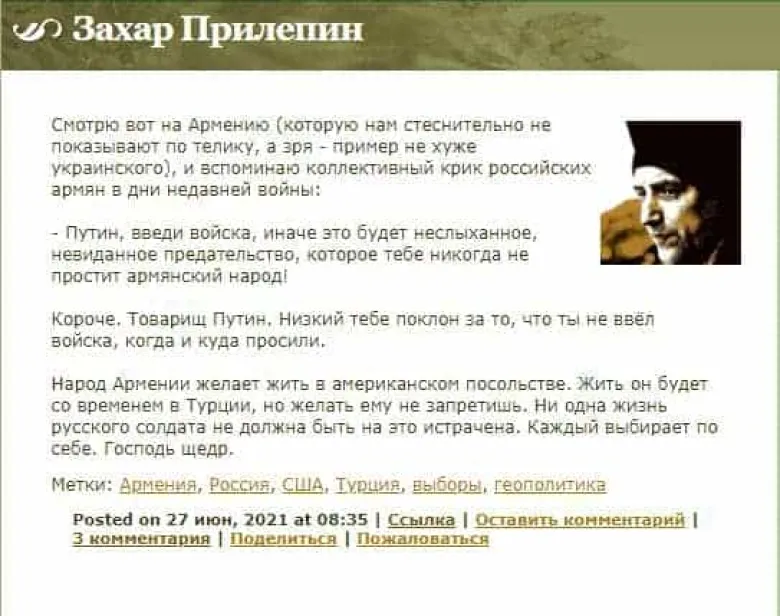 Очень долго думала стоит ли вообще реагировать на Захар Прилепин-а и в целом на людей подобных Игоря Коротченка, которых Азербайджан вербует в самой России. Я понимаю, конечно, что деньги для многих важнее себя, Родины , матери.... но и все-таки совесть то надо иметь Захар. Вы слишком маленький человек, чтоб говорить об многовековом армянском народе, делать свои глупые выводы и упоминать в своих продажных записях имя Господа. Ибо Библия говорит в третей заповеди- "Не поминай имени Господа Бога твоего всуе".