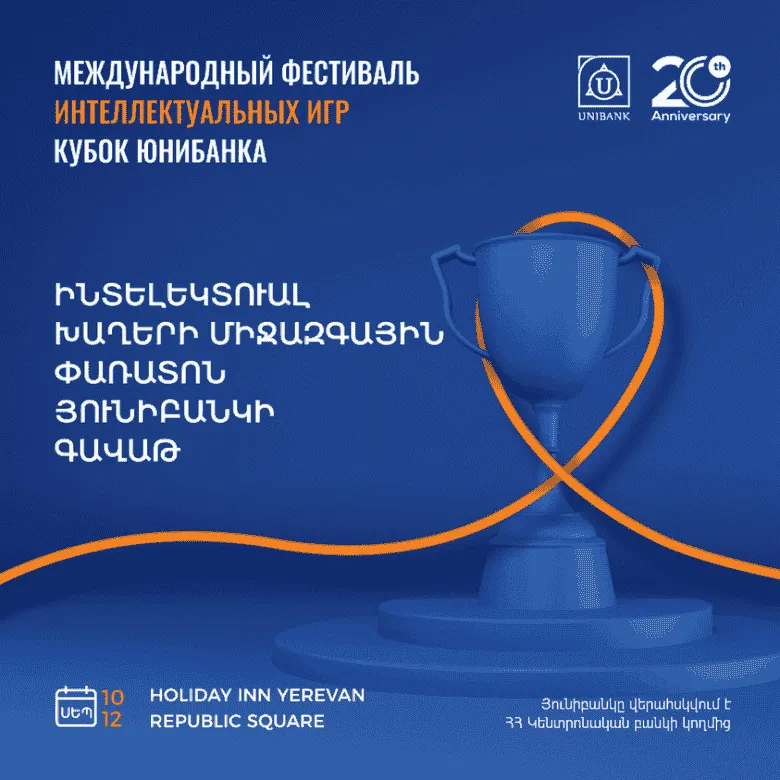 Սեպտեմբերի 10-12-ը Երևանում կկայանա «Յունիբանկի գավաթ» ինտելեկտուալ խաղերի միջազգային փառատոն: Միջոցառումը նվիրված է Յունիբանկի գործունեության 20-ամյակին: Բանկը հանդես է գալիս որպես գլխավոր հովանավոր: