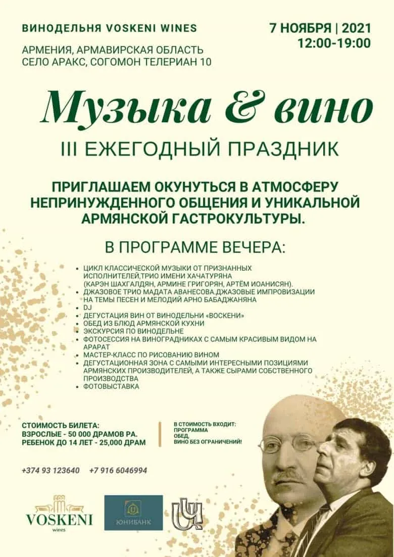 Նոյեմբերի 7-ին Հայաստանում երրորդ անգամ Voskeni Wines գինեգործարանում կկայանա «Երաժշտության և գինու» ամենամյա տոնակատարությունը: Այս անգամ միջոցառումը նվիրված է երկու մեծագույն կոմպոզիտորների՝ Ալ. Սպենդիարյանի՝ 150, և Առնո Բաբաջանյանի՝ 100-ամյակներին: