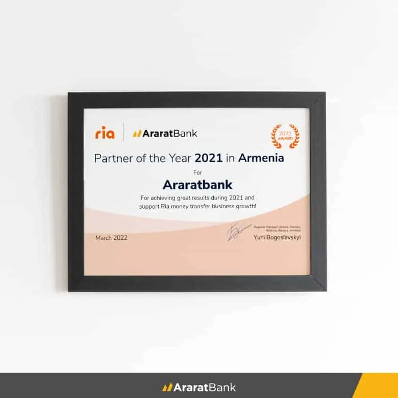 ԱրարատԲանկը Ria Money Transfer համակարգի կողմից հերթական անգամ արժանացել է 2021թ․«Տարվա գործընկեր» մրցանակին։