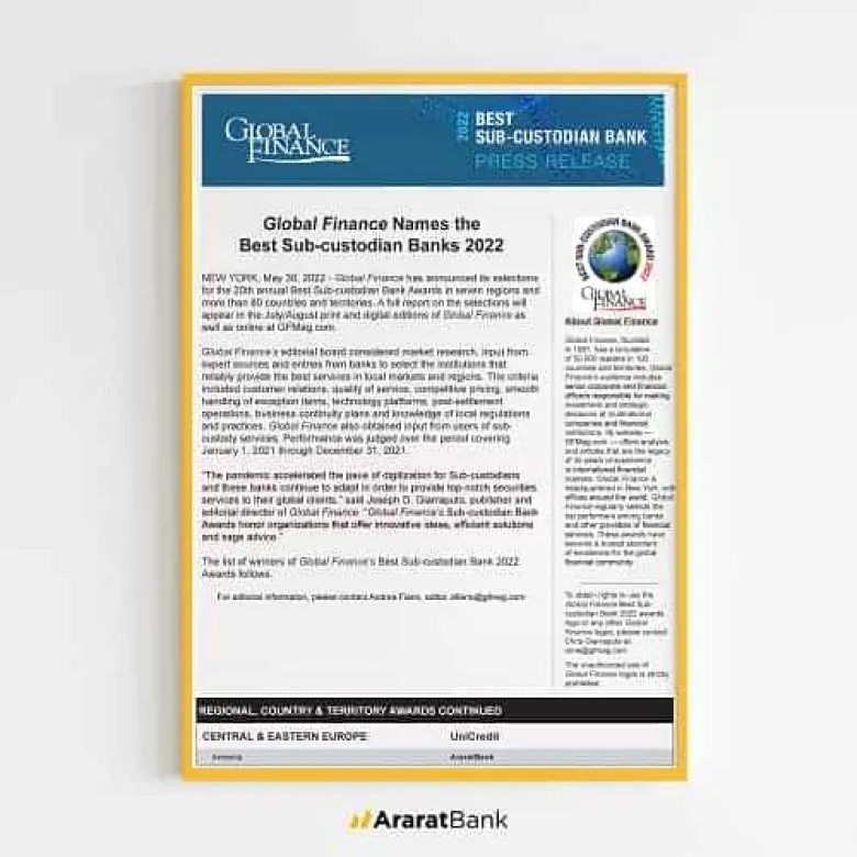 ԱրարատԲանկը երկրորդ տարին անընդմեջ «Global Finance» միջազգային հեղինակավոր ամսագրի մասնագիտական թիմի կողմից ճանաչվում է Հայաստանի «Լավագույն ենթապահառու բանկ»: