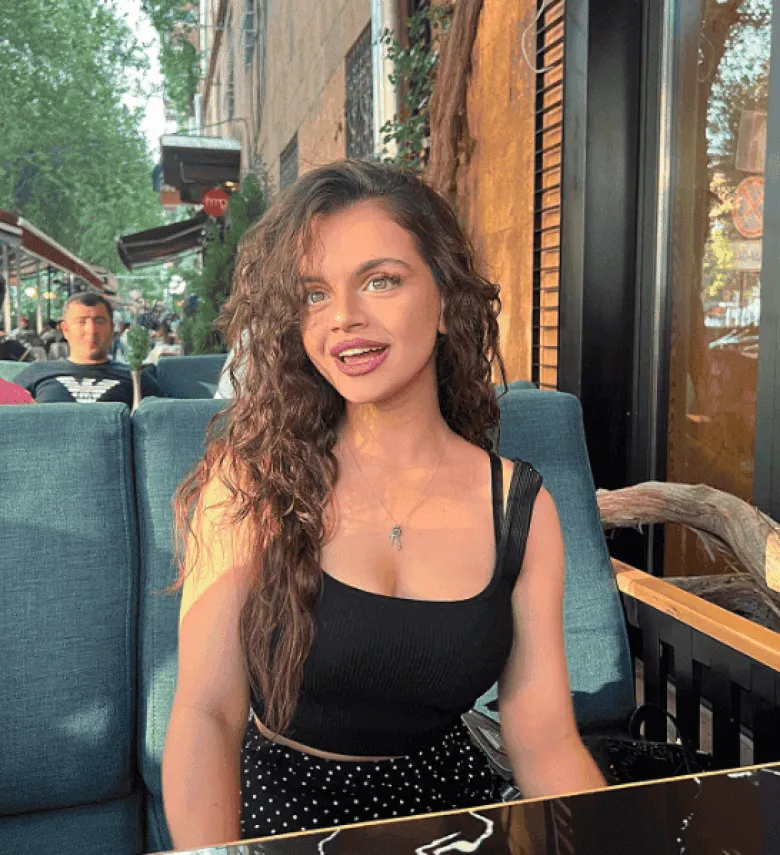 Լուսանկարներում նա կրում է կարճ սև տոպ և թրենդային կիսաշրջազգեստ, կերպարն ամբողջական են դարձրել նուրբ դիմահարդարումն ու շքեղ գանգուրները: