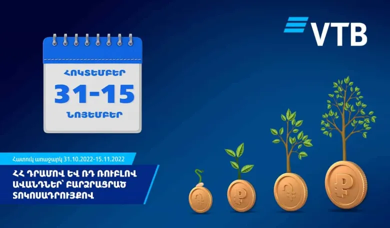 ՎՏԲ-Հայաստան Բանկը Խնայողությունների միջազգային օրվա առթիվ բարելավել է ավանդների պայմանները։ Կախված ներդրման ժամկետից՝ ՀՀ դրամով ավանդների առավելագույն տոկոսադրույքն աճել է 0,5 տոկոսային կետով՝ մինչև 10․5%: ՌԴ ռուբլով միջոցների ներդրման դեպքում առավելագույն աճը կազմել է 3 տոկոսային կետ՝ մինչև 5․5%։ Առաջարկը տարածվում է «Շահավետ» և «Պրոգրես» ավանդների վրա։
