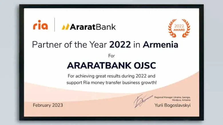 Ria Money Transfer համակարգն ԱրարատԲանկին հերթական անգամ արժանացրել է 2022թ․ «Տարվա գործընկեր» մրցանակին։