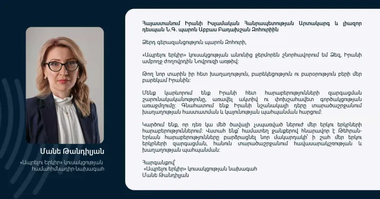 «Ապրելու երկիր» կուսակցության անունից ջերմորեն շնորհավորում եմ Ձեզ, Իրանի ամբողջ ժողովրդին Նովրուզի առթիվ։ Թող նոր տարին իր հետ խաղաղություն, բարեկեցություն ու բարօրություն բերի մեր բարեկամ Իրանին։