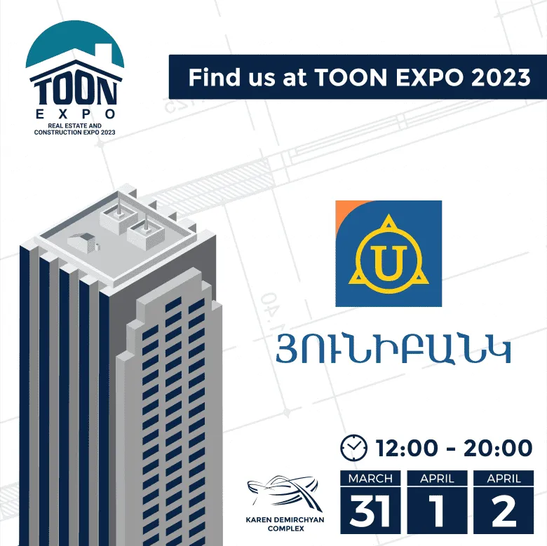 Յունիբանկը կմասնակցի «TOON EXPO 2023» անշարժ գույքի և շինարարության խոշորագույն միջազգային ցուցահանդեսին, որն անցկացվելու է 2023 թվականի մարտի 31-ից ապրիլի 2-ը Կարեն Դեմիրճյանի անվան Մարզահամերգային համալիրում։ Ցուցահանդեսը կգործի ժամը 12:00-20:00-ն: