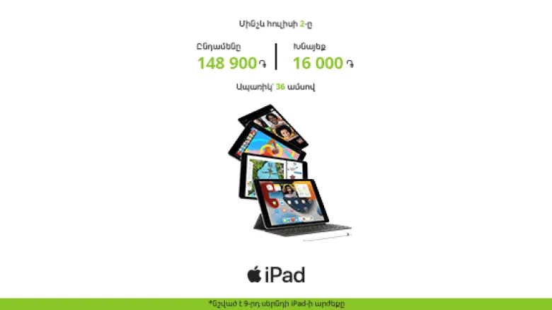 Մինչև հուլիսի 2-ը «Յուքոմ» ընկերության վաճառքի և սպասարկման կենտրոններում, ինչպես նաև Ucom-ի առցանց խանութում հնարավոր է ձեռք բերել 9-րդ սերնդի 64 ԳԲ ծավալով և Wi-Fi կապի հնարավորությամբ iPad 10.2 մոդելն ընդամենը 148 900 դրամով։