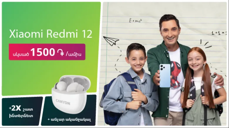 В преддверии нового учебного года, до 30 сентября, компания Ucom предлагает приобрести смартфон Xiaomi Redmi 12 на невероятных условиях: всего за 1500 драмов в месяц, и получить беспроводные наушники Canyon TWS-5 и в 2 раза больше интернета на весь учебный год, а также красивый номер телефона и возможность воспользоваться вложениями предоплатного тарифного плана Level Up 1800 бесплатно в течение 1 месяца. Предложение двойного объема интернета в 12 ГБ действует для предоплатного тарифного плана Level Up 1800 по 31 мая 2024 года.