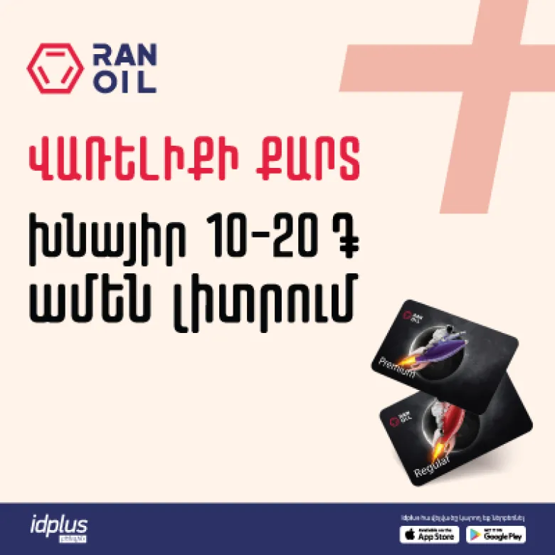 И так, в Idplus уже доступна возможность покупки топливных карт компании Ran Oil. Покупая топливные карты, ты сэкономишь 10-20 драмов в каждом литре, что в месяц обернется в круглую сумму. Для приобретения топливной карты необходимо войти в приложение Idplus, затем нажать кнопку «Купить топливную карту» на главной странице или в каталоге, где будут отображены три вида топлива: регуляр, премиум и дизельное. После выбора необходимого вида топлива на сразу открывшейся новой странице можно ознакомиться с прайс-листом. Есть возможность выбрать топливную карту от 20 до 120 литров (и сэкономить 10 драм), или более 120 литров (и сэкономить 20 драм)։ сразу в прайс-листе ты увидишь сколько сэкономишь, купив топливную карту через Idplus.