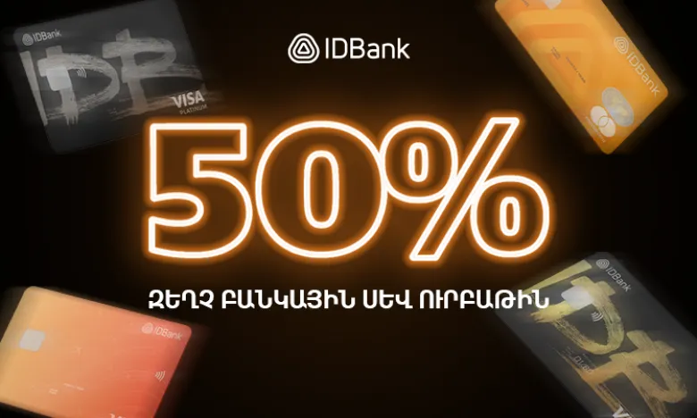Սև ուրբաթին ընդառաջ՝ նոյեմբերի 10-ից դեկտեմբերի 1-ը ներառյալ, պատվիրե՛ք IDBank-ի Visa Gold, Travel, Visa Platinum, Mastercard Standard քարտերը և ստացե՛ք 50% զեղչ քարտերի գործողության ողջ ժամանակահատվածի համար։