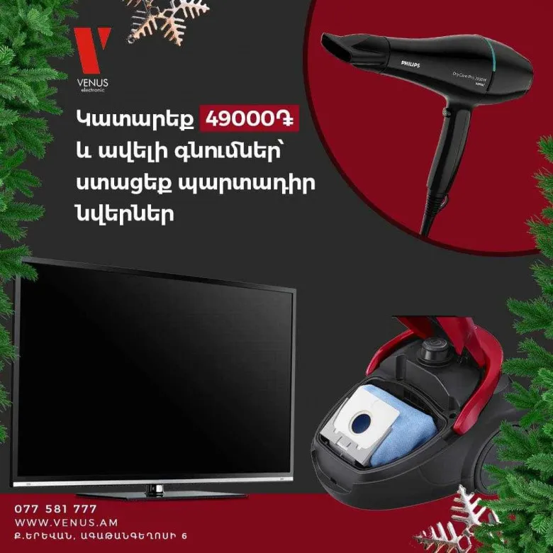 Մինչև ԴԵԿՏԵՄԲԵՐԻ 31-ը համեցե’ք Վենուս խանութ-սրահներ, կատարե’ք 49 000 դրամ և ավելի գնումներ, ստացե’ք պարտադիր նվերներ ՝ վարսահարդարիչից մինչև հեռուստացույց: