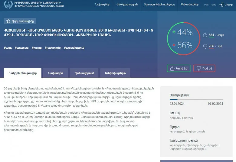 Իրավական ակտերի նախագծերի հրապարակման միասնական կայքում՝ e-draft.am-ում տեղադրված նախագծերի վերաբերյալ հնարավոր է ոչ միայն կարծիք հայտնել, այլև քվեարկել: Ինչպես հայտնի է, հունվարի 22-ին հանրային քննարկման է ներկայացվել կառավարության որոշման նախագիծ, որով մասնավորաբար նախատեսվում է «Հայոց պատմություն» առարկան վերանվանել «Հայաստանի պատմություն»: Այս նախագծի հետ կապված հետաքրքիր զարգացումներ են ստանում ոչ միայն հանրային քննարկումները, այլև օնլայն քվեարկության ընթացքը: Եթե առաջին մեկ օրվա ընթացքում դեմ քվեարկածները կազմում էին մոտ 80 տոկոս, ապա հաջորդ երկու օրերին միանգամից սկսեց աճել «կողմ»-երի թիվը՝ ժամանակ առ ժամանակ նույնիսկ մոտենալով 50 տոկոսի շեմին: Երեկ երեկոյան հարաբերակցությունը 44/56 էր: