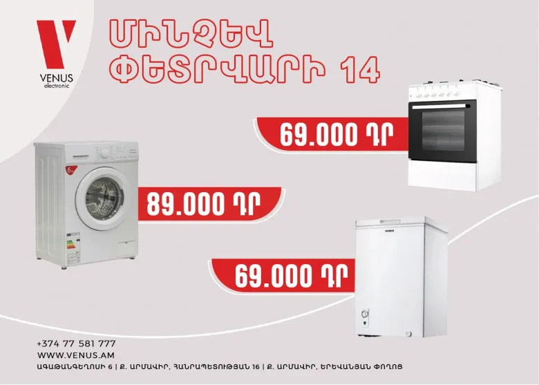 Վենուս խանութ-սրահը տրամադրում է կենցաղային տեխնիկա՝ մեծ զեղչերով