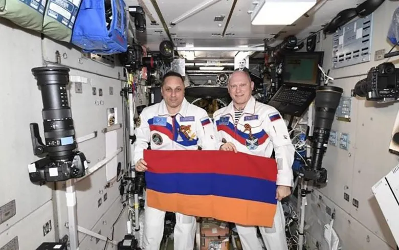 «2017 թ.-ին Ալմա Աթայի թանգարանում մեզ հպարտությամբ պատմում էին, որ այնտեղ գտնվող դրոշը Նուրսուլթան Նազարբաևի խնդրանքով եղել է տիեզերքում: Ու այդ պահին ինձ մոտ միտք առաջացավ՝ որքան լավ կլիներ, որ Հայաստանի և Երևանի դրոշները հայտնվեին տիեզերքում: Հանդիպումներ ունեցա, ծանոթացա տիեզերագնաց Օլեգ Արտեմևի հետ: Ռուսաստանում Հայաստանի դեսպանի հետ հանդիպման ժամանակ դրոշները փոխանցեցինք Օլեգ Գերմանիչին, նախքան այդ դրանք օրհնել էր Հայոց Հայրապետը: Այդ դրոշները տիեզերագնացներ Օլեգ Արտեմևը և Անտոն Շկապլերովը ծածանեցին տիեզերքում: Ընդ որում, այդ տարին՝ 2018 թ.-ը, համընկավ Հայաստանի Առաջին Հանրապետության հռչակման հարյուրամյակի և Երևանի 2800-ամյակի հետ, և նրանք էլ տեսագրության միջոցով շնորհավորեցին երևանցիներին Երևանի տարեդարձի կապակցությամբ»,-«Փաստի» հետ զրույցում ասում է սանկտպետերբուրգցի հայ բարերար Հրաչյա Պողոսյանը:
