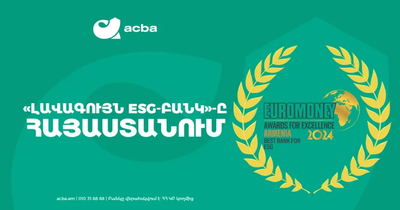 Բրիտանական աշխարհահռչակ Euromoney ֆինանսական պարբերականը ESG (բնապահպանական, սոցիալական և կառավարում) չափանիշների շրջանակում Ակբա բանկին ճանաչել է Հայաստանի «Լավագույն ESG-Բանկ» (Armenia's Best Bank for ESG):