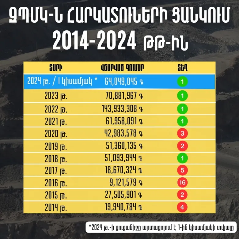 ՀՀ պետական եկամուտների կոմիտեն հրապարակել է 2024թ. երկրորդ եռամսյակի 1000 խոշոր հարկատուների ցանկը: Այդ տվյալների համաձայն՝ ԶՊՄԿ-ն ավելի քան 29 միլիարդ դրամով ավելացրել է հարկային վճարումները՝ նախորդ տարվա նույն ժամանակահատվածի համեմատ։