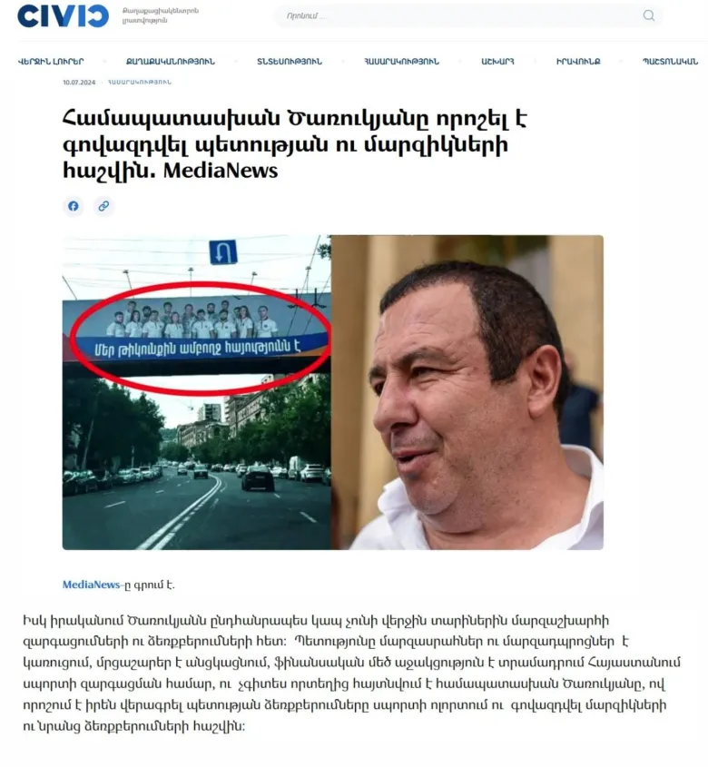2024թ Փարիզի օլիմպիական խաղերը դեռ չմեկնարկած իշխանական լրատվականներից մեկում ` Civic.am-ում հոդված էր գրվել, որտեղ բառացի ասվում էր. «ՀԱՕԿ նախագահ Գագիկ Ծառուկյանը ընդհանրապես կապ չունի վերջին տարիներին մարզաշխարհի զարգացումների ու ձեռքբերումների հետ:Պետությունը մարզասրահներ ու մարզադպրոցներ է կառուցում,մրցաշարեր է անցկացնում, ֆինանսական մեծ աջակցություն է տրամադրում Հայաստանում սպորտի զարգացման համար ու չգիտես որտեղից հայտնվում է Ծառուկյանը ու որոշում է իրեն վերագրել պետության ձեռքբերումները…» :