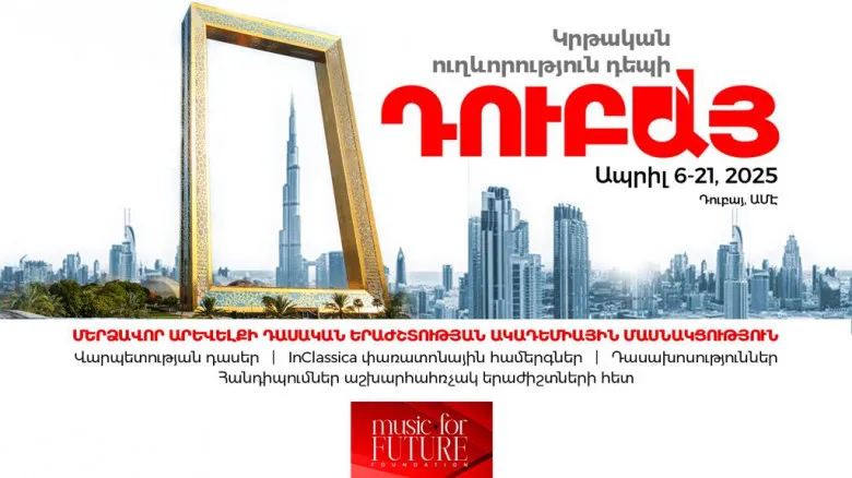 Ближневосточная Академия классической музыки совместно с Фондом «Музыка во имя будущего» предлагают уникальную возможность для путешествий. Фонд уже в третий раз инициирует «Образовательную поездку» в Объединенные Арабские Эмираты, в частности, в Дубай, с целью участия в Ближневосточной академии классической музыки (Middle East Classical Music Academy-MECMA). Она пройдет с 6 по 21 апреля 2025 года. Фонд получил эксклюзивное предложение от организаторов Академии для учеников и учителей музыкальных школ Армении.