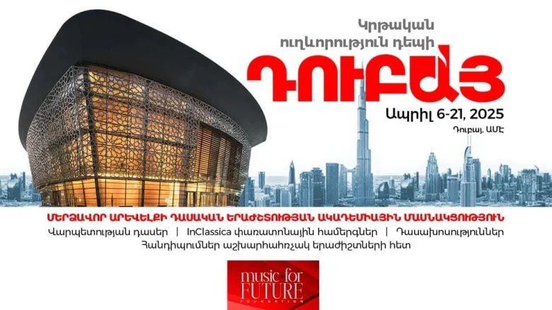 На днях мы сообщили, что Ближневосточная Академия классической музыки совместно с Фондом Армении «Музыка во имя будущего» предлагают уникальную возможность для путешествий. Фонд уже в третий раз инициирует «Образовательную поездку» в Объединенные Арабские Эмираты, в частности, в город Дубай, с целью участия в Ближневосточной Академии классической музыки (Middle East Classical Music Academy-MECMA), которая пройдет с 6 по 21 апреля 2025 года.