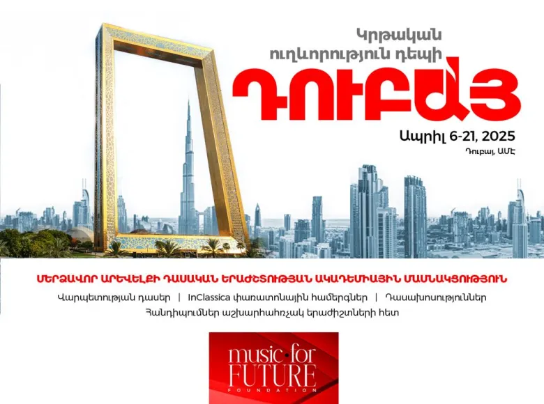 Մերձավոր Արևելքի դասական երաժշտության ակադեմիան Հայաստանի «Երաժշտություն հանուն ապագայի» հիմնադրամի հետ միասին առաջարկում են ճանապարհորդության բացառիկ հնարավորություն դեպի Դուբայ՝ Մերձավոր Արևելքի դասական երաժշտության ակադեմիային (Middle East Classical Music Academy-MECMA) մասնակցելու նպատակով, որն անցկացվելու է 2025 թ․-ի ապրիլի 6-ից 21-ը: Ծրագրում ընդգրկվելու հնարավորություն ունեն Հայաստանի երաժշտական և արվեստի դպրոցի/քոլեջի/կոնսերվատորիայի սան հանդիսացող պատանի երաժիշտները, որոնք դիմելու օրվա դրությամբ 12-18 տարեկան են (18-ը ներառյալ) և սովորում են հետևյալ ուղղություններով՝ լարային գործիքներ (ջութակ, ալտ, թավջութակ), փողային գործիքներ (ֆլեյտա, հոբոյ, կլարնետ, ֆագոտ, գալարափող, շեփոր, տրոմբոն, սաքսոֆոն) և դաշնամուր: Ծրագրին կարող են մասնակցել նաև երաժշտական կրթական հաստատությունների ուսուցիչներն ու դասախոսները՝ որպես պասիվ մասնակիցներ բոլոր վարպետության դասերին և դասախոսություններին: