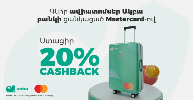 Ակբա բանկի Mastercard քարտապանները մինչև դեկտեմբերի 25-ը ներառյալ հնարավորություն ունեն գնել ավիատոմս և միանվագ ստանալ մինչև 20% քեշբեք՝ առավելագույնը 20 000 ՀՀ դրամ սահմանաչափով։