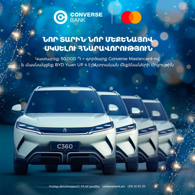 Արշավի շրջանակում 23.12․2024-28․02․2025թթ․ ներառյալ կատարելով հանրագումարային 50,000 ՀՀ դրամի կամ համարժեք արտարժույթի չափով անկանխիկ գործարքներ նշված քարտատեսակներով՝ Կոնվերս Բանկի քարտապանները կստանան գործարքների գնի մինչև 15 տոկոսի չափով քեշբեք, ինչպես նաև 4 Էլեկտրական մեքենաներից մեկը պատահականության սկզբունքով հաղթելու հնարավորություն: