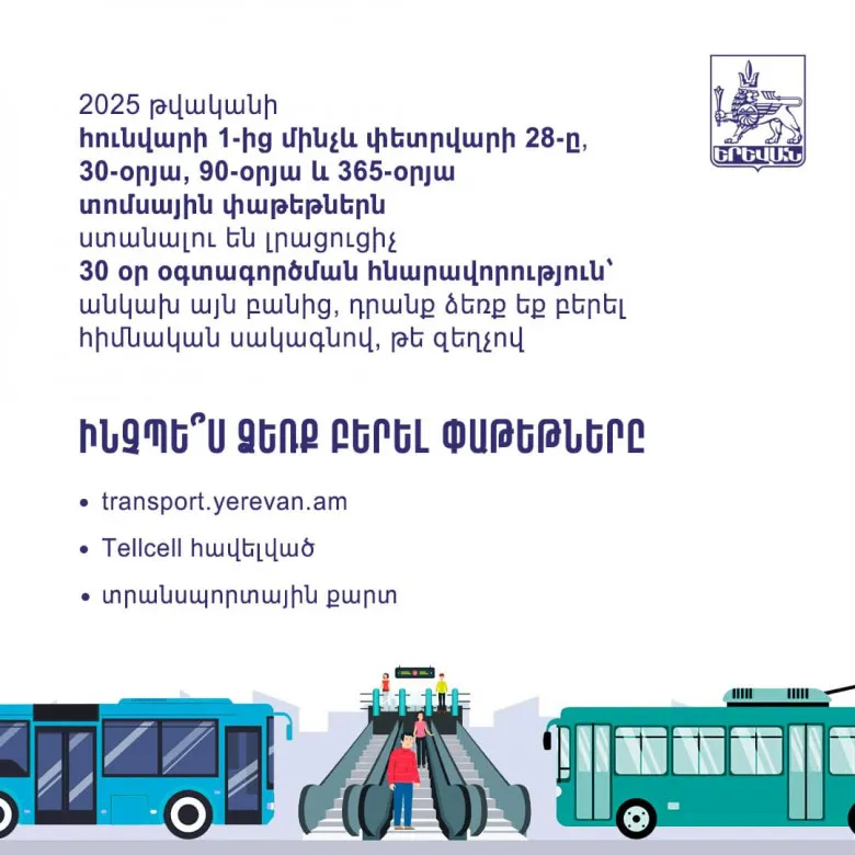 2025 թվականի հունվարի 1-ից մինչև փետրվարի 28-ը ներառյալ ձեռք բերած 30-օրյա, 90-օրյա և 365-օրյա տոմսային փաթեթները կստանան լրացուցիչ 30 օր օգտագործման հնարավորություն,