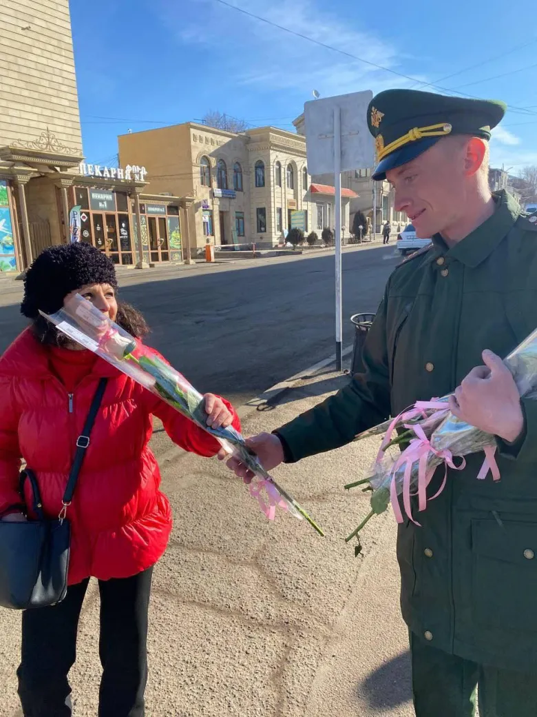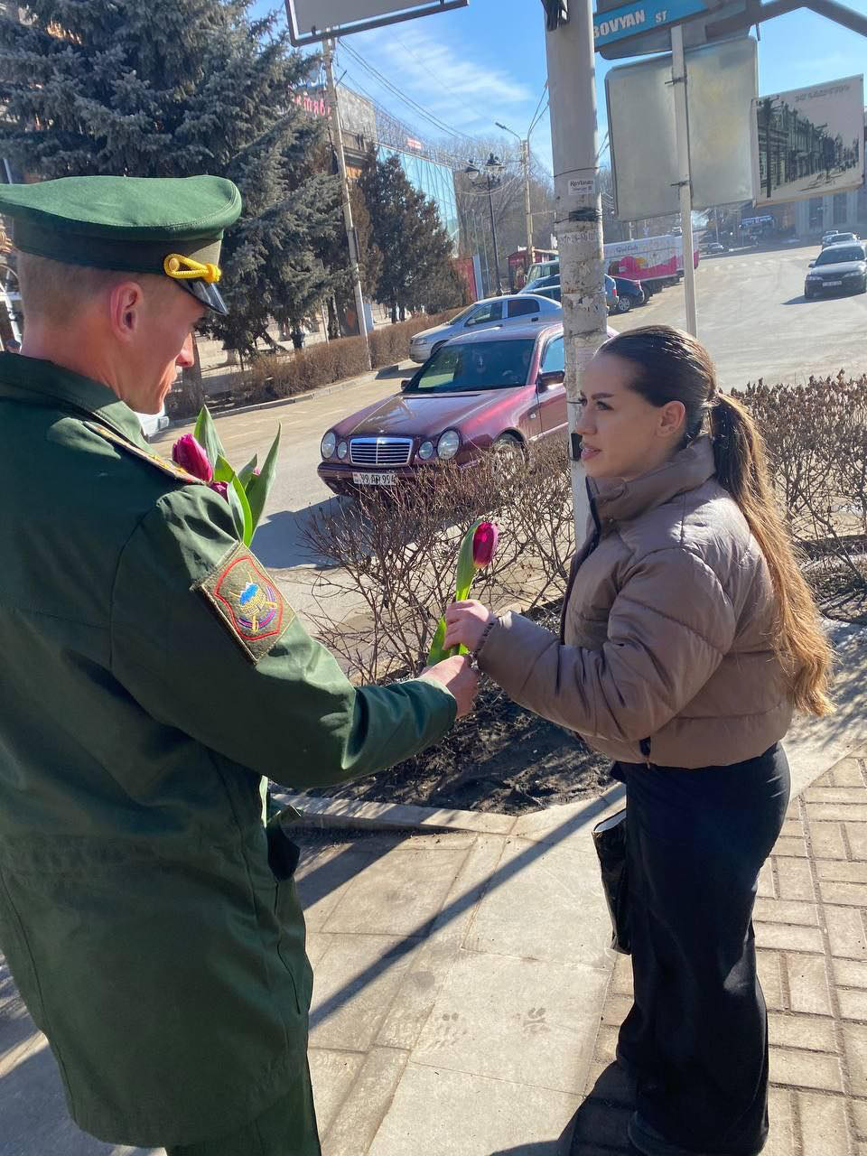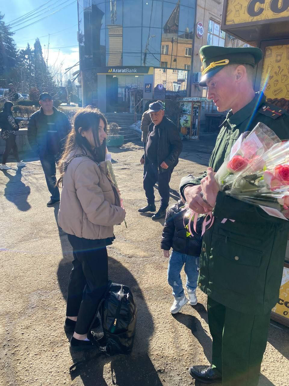 Сегодня офицеры базы на улицах города дарили представительницам прекрасной половины Армении цветы.