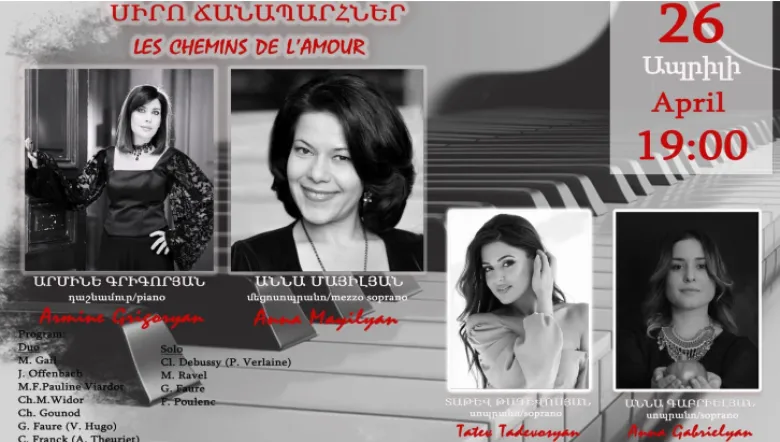 Ֆրանկոֆոնիայի օրերի շրջանակներում ապրիլի 26-ին, ժամը՝ 19:00-ին Արամ Խաչատրյանի տուն-թանգարանը սիրով հրավիրում է իր հյուրընկալ համերգասրահ «Les chemins de l’amour / Սիրո ճանապարհներ» խորագրով համերգին: