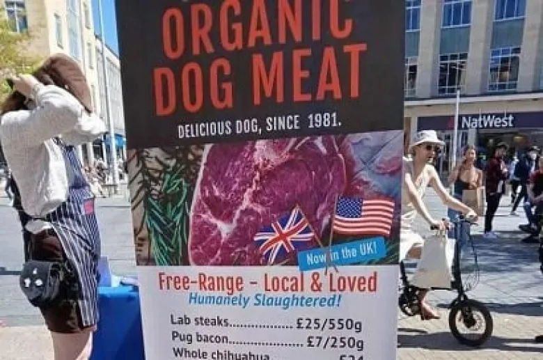 Их цель? Привлечь внимание к «этическому лицемерию» людей, возмущенных потреблением собачатины, в то время как они все еще едят животных, таких как коровы, свиньи и овцы.