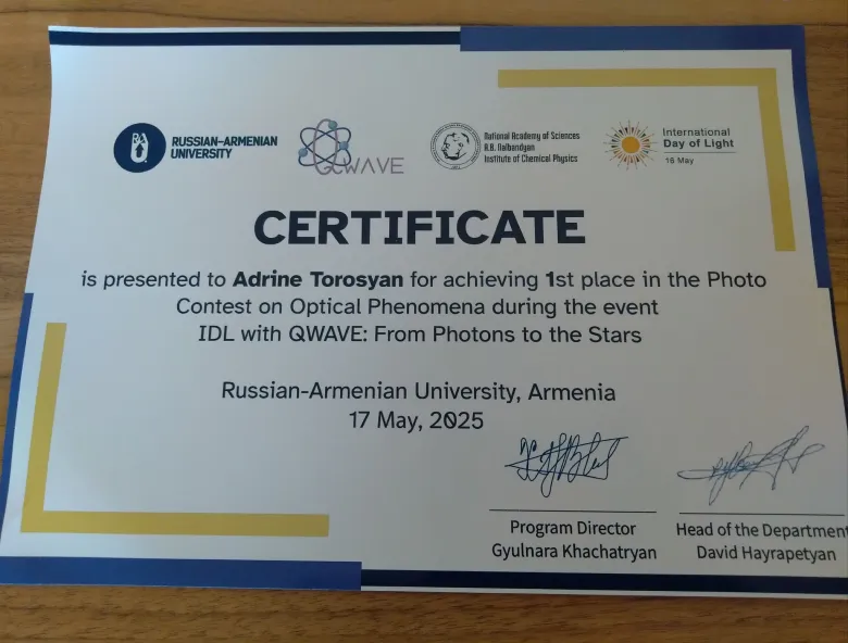 Ադրինե Թորոսյանի հերթական 1-ին պատվավոր մրցանակը՝ այս անգամ էլ գիտական լուսանկարների մրցույթում. ֆիզիկայի փայլուն գիտելիքներս համադրվեցին լուսանկարչի, հեռուստառեժիսորի մասնագիտական կարողություններիս հետ: