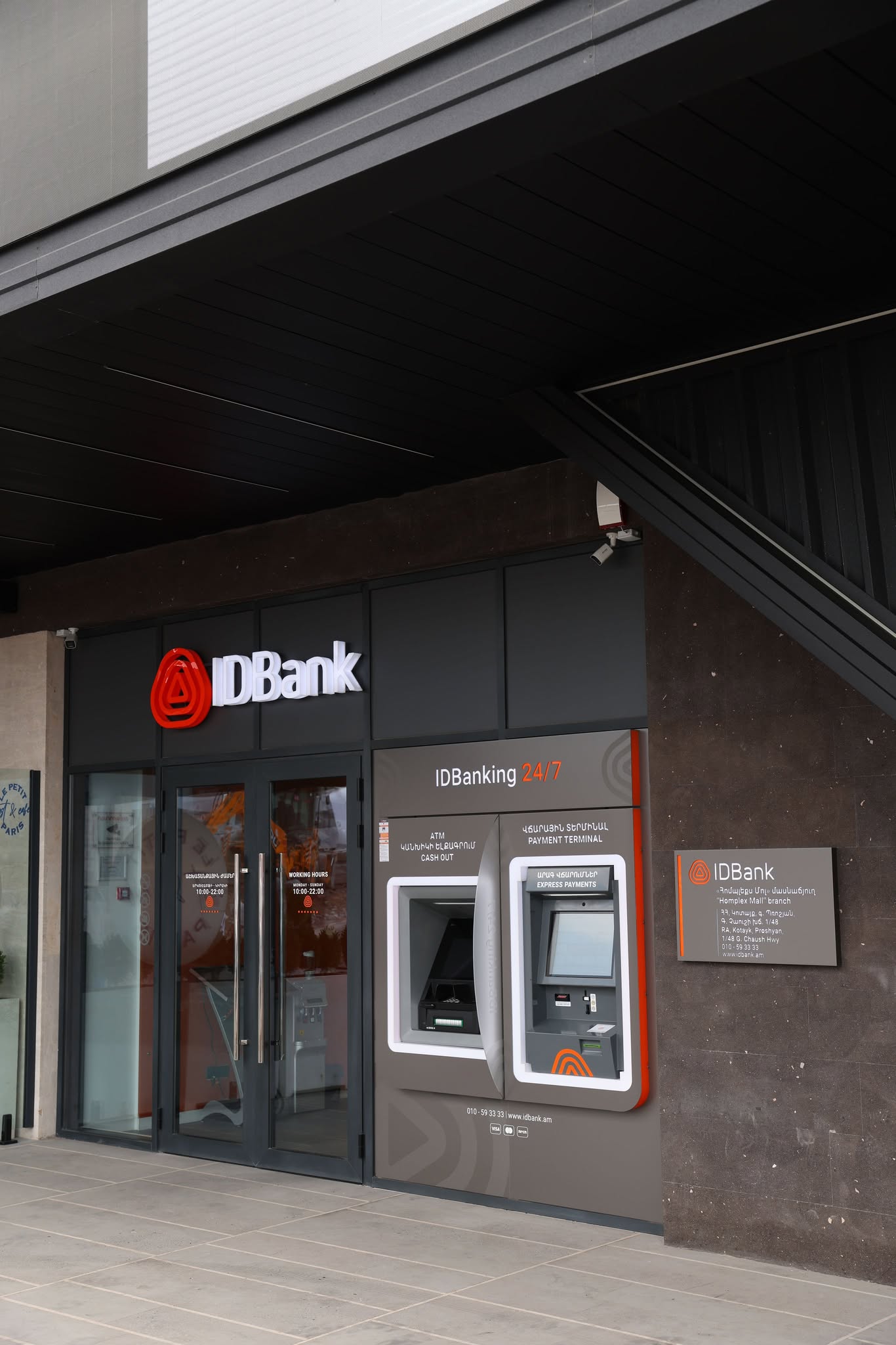 Адрес Homplex Mall и нового филиала IDBank: село Прошян, шоссе Г. Чауша 1/4. Филиал имеет два входа — как с внешней стороны, так и изнутри торгового центра.