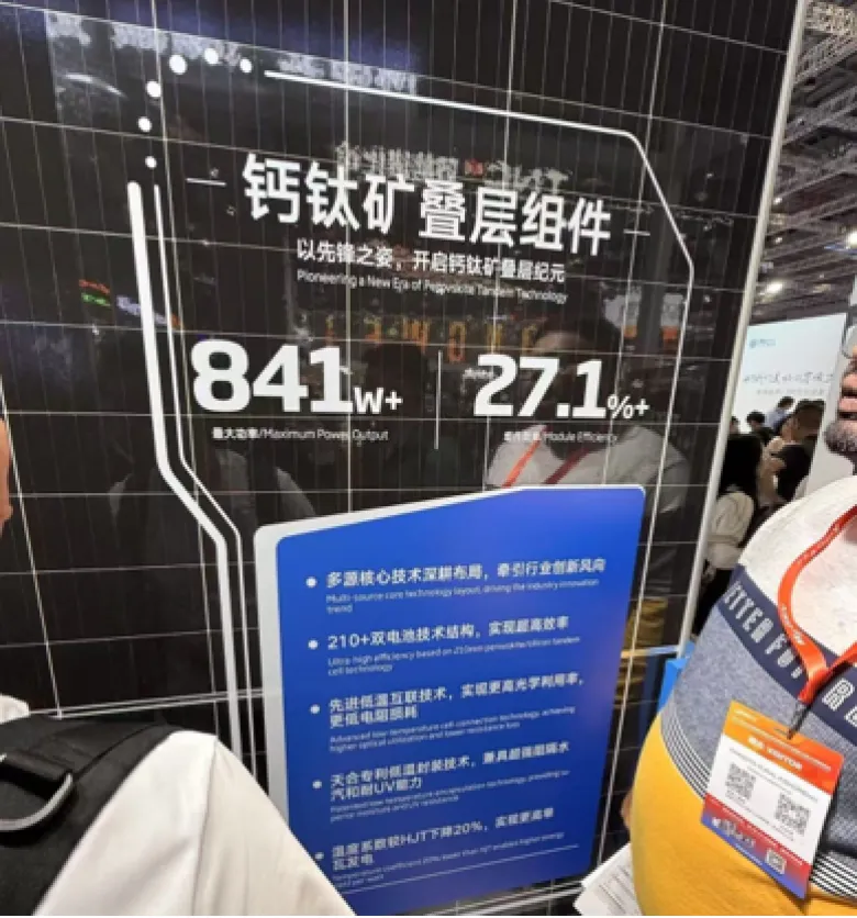 Չինական Trina Solar ընկերությունը ներկայացրել է 841 Վտ հզորությամբ պերովսկիտ-սիլիցիումային տանդեմային արևային մոդուլի նախատիպը, գրում է prosolar.ru–ն։ Ընկերությունը Չինաստանի Շանհայում կայացած SNEC միջազգային ֆոտովոլտային և խելացի էներգիայի ցուցահանդեսում է ներկայացրել այդ նախատիպը։ Վահանակն ունի 27.1 % ընդհանուր մոդուլային արդյունավետություն և հիմնված է 210 մմ տանդեմային բջիջների վրա։ Trina-ն հայտարարել է, որ օգտագործել է ցածր ջերմաստիճանի միացման տեխնոլոգիա ավելի բարձր օպտիկական օգտագործման և ավելի ցածր դիմադրության կորուստների հասնելու համար։