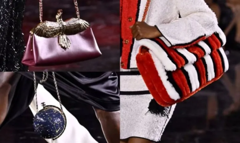 Вечерние клатчи играют с формой и цветом: от сдержанных фиолетовых тонов до эффектных trompe-l’oeil, где звездное небо будто помещается на ладони или закручивается на золотой цепочке.