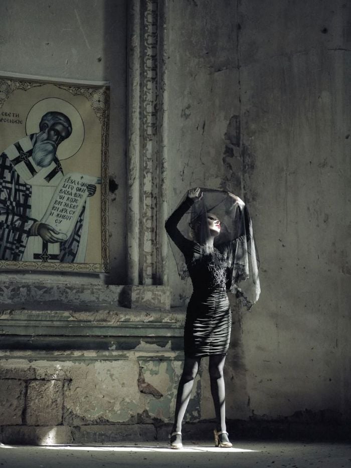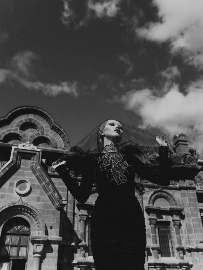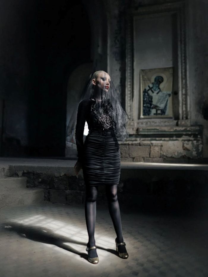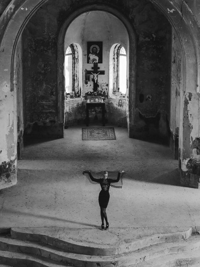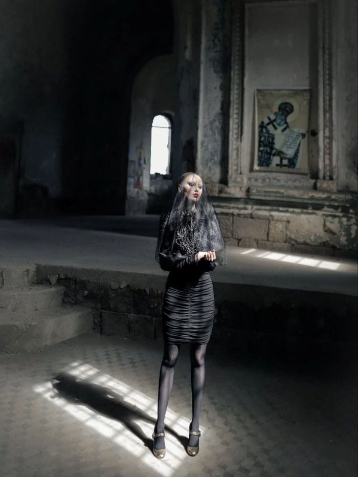 И именно ей посвящена снятая в заброшенной русской церкви Святого Арсения в Гюмри фотосессия Марины Ароян. Определённо, это не эстетизация религиозного сюжета и не дань прошлому, скорее визуальное расследование того, как святость стала формой дисциплины, как церковь научилась подавать женскую независимость под видом «чистой жертвы». Ароян выстраивает кадр не умилённый, не в светлых, «чистых» тонах, а требовательный, с игрой светотени и контрастами.