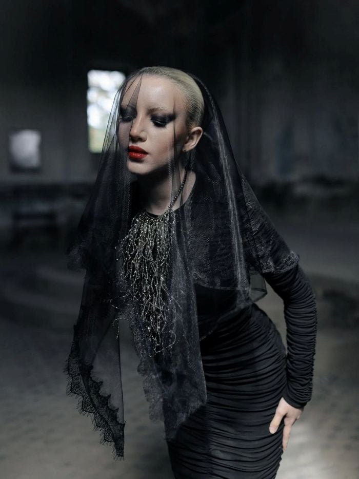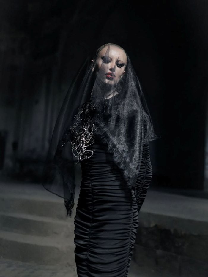 Образ на этих снимках можно интерпретировать по-разному: чёрное платье воспринимается и как траур, и как броня, собранная из внутренней решимости и тишины. В нём соединяются скорбь, достоинство и вызов.