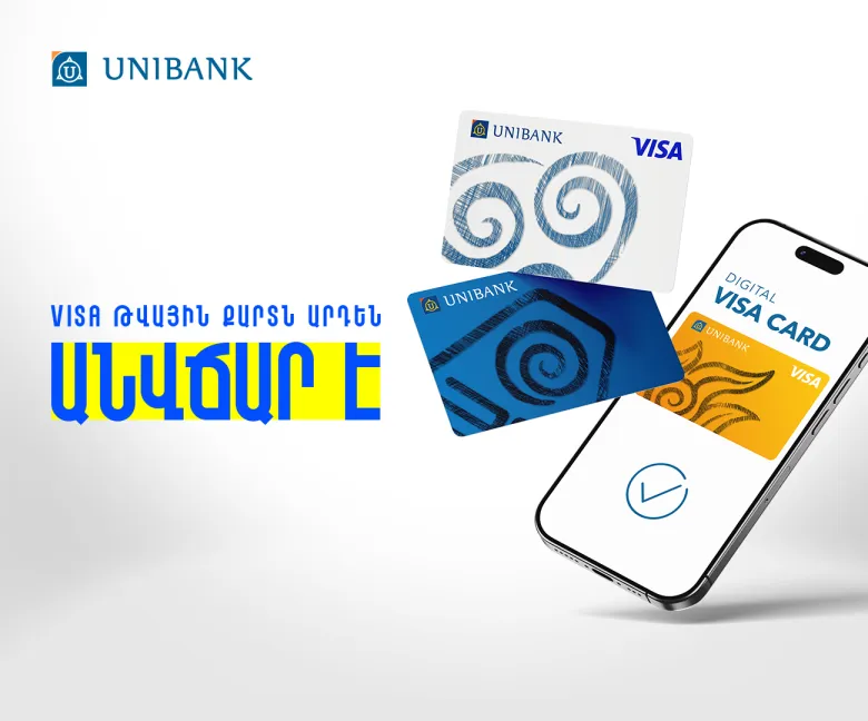 Յունիբանկի Visa թվային քարտերը դարձել են անվճար ռեզիդենտ հաճախորդների համար: Թվային քարտն ակնթարթորեն կարելի է ստեղծել UNIMobile հավելվածի միջոցով՝ պարզապես ընտրելով նախընտրած դիզայնը և արժույթը՝ ՀՀ դրամ, ԱՄՆ դոլար կամ եվրո: Թողարկումից անմիջապես հետո քարտը հասանելի է դառնում առցանց վճարումների և փոխանցումների համար, այն նաև կարող է կցվել Apple Pay-ին և Google Pay-ին՝ անհպում վճարումների համար: