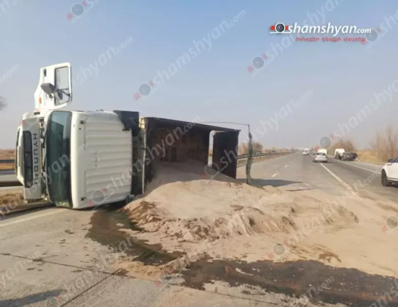 Երևան-Երասխ ճանապարհին ավազով բարձված բեռնատարը բախվել է երկաթե արգելապատնեշին և կողաշրջվել