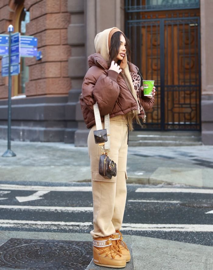 В образе Мариетты Кочарян считывается один из ключевых трендов последних сезонов - functional chic. Спортивный костюм с карго-брюками и пуховик работают как база, но за счёт аккуратной цветовой гаммы и чётких форм образ не уходит в «домашний». Moon Boot здесь - не просто тёплая обувь, а модный маркер après-ski эстетики, которая давно вышла за пределы курортов. Сумка Louis Vuitton добавляет образу нужный уровень «собранности» и визуального веса.